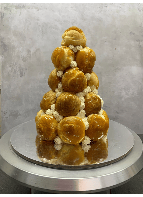 SIN CUPO 23,24 Y 25 DE DICIEMBRE, 2025Famosa preparación francesa que consiste en una torre de profiteroles rellenos de crema pastelera y cubiertos en crujiente caramelo y chocolate montados a un cono hueco. Fotografía torre 40 unidades de profiterolATENCION: debe consumirse el mismo día de compra.NO refrigerarSI mantener en un lugar frescoSI consumir durante el día.SI transladar con cuidado, producto delicado.