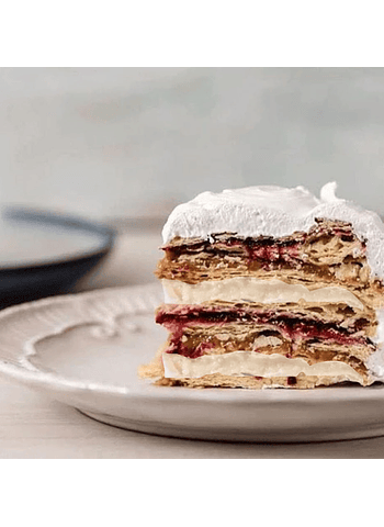 Deliciosa torta de hojarasca casera rellena con manjar, reducción de maracuyá y crema diplomática. Cubierta en merengue suizo o crema.