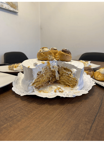 Deliciosa torta de hojarasca casera rellena con manjar, mermelada de damasco y crema diplomática, cubierta en merengue o crema. Decorada con profiteroles.