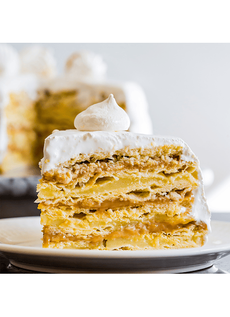 Deliciosa torta de hojarasca casera rellena con manjar, puré de lúcuma natural y crema diplomática (mezcla de crema batida y pastelera), cubierta de merengue suizo o cremaSi desea puede escribirnos por WhatsApp +56990705560
